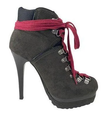 Faux suede boots with patent leather trim, and ultra high stiletto heel. Full lace front. Dark gray.