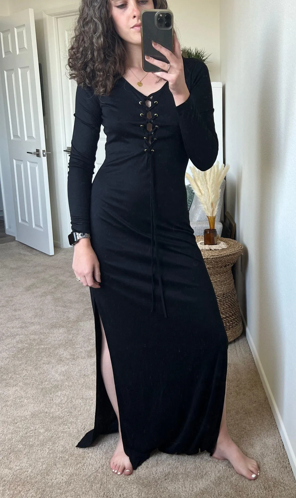 Black long sleeve maxi dress from L’agence. Front lace up detailing. Double side slits. Size XS. Two teeny tiny holes on the right side of the hem in the back. Hardly noticeable. Excellent used condition otherwise
