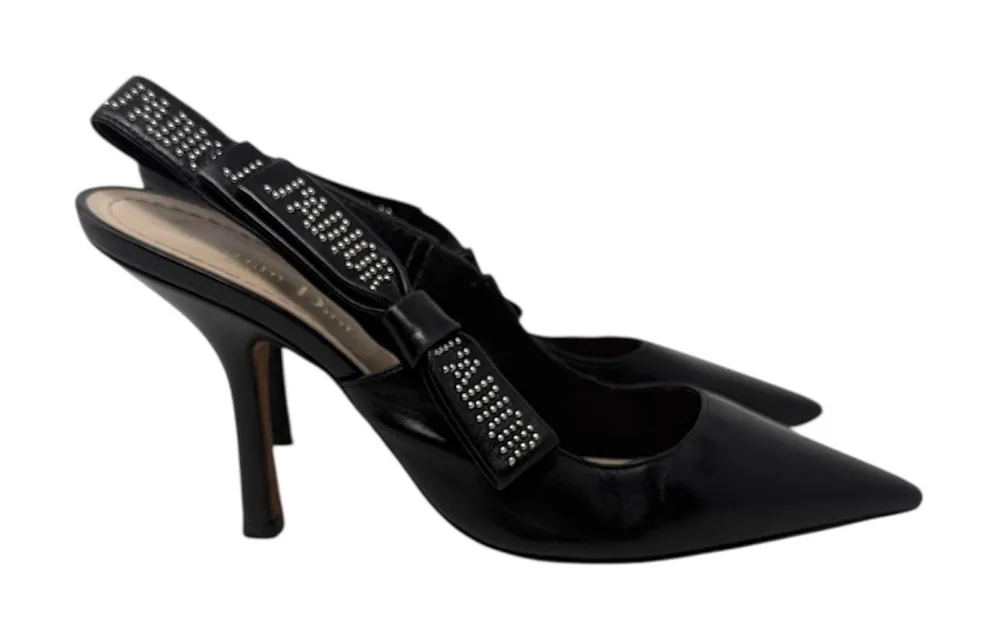 Dior J’Adior black leather embellished logo ribbon heels. Size 37.5 Authentic Heel height approxim... Show more