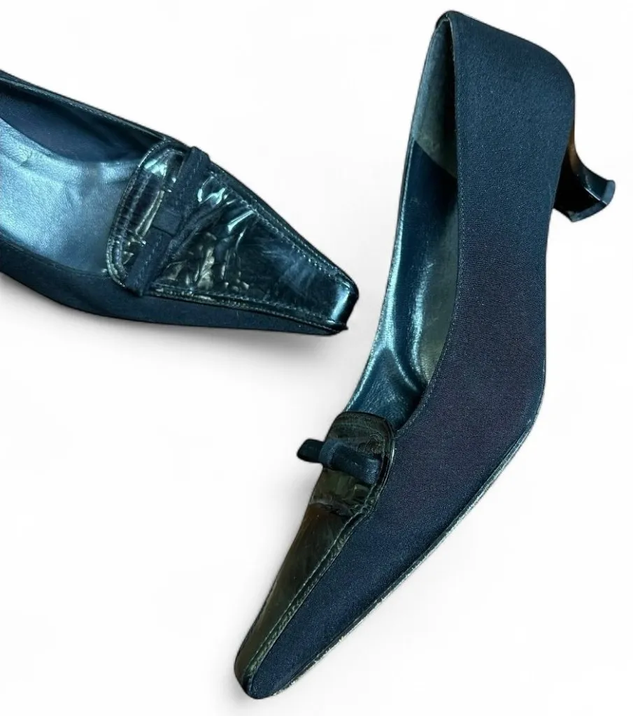 STUART WEITZMAN Black Patent Leather and Fabric Square Toe Pumps Features: Square toe wi... Show more