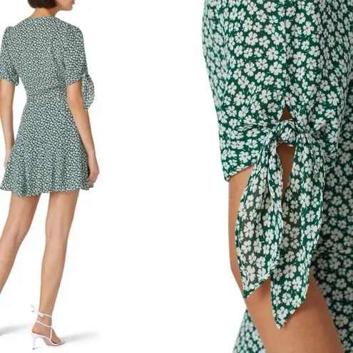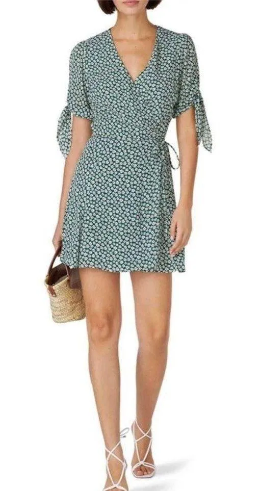 Micro florals pattern this RSVP-ready wrap dress from Reformation. Green floral printed crepe Wrap... Show more