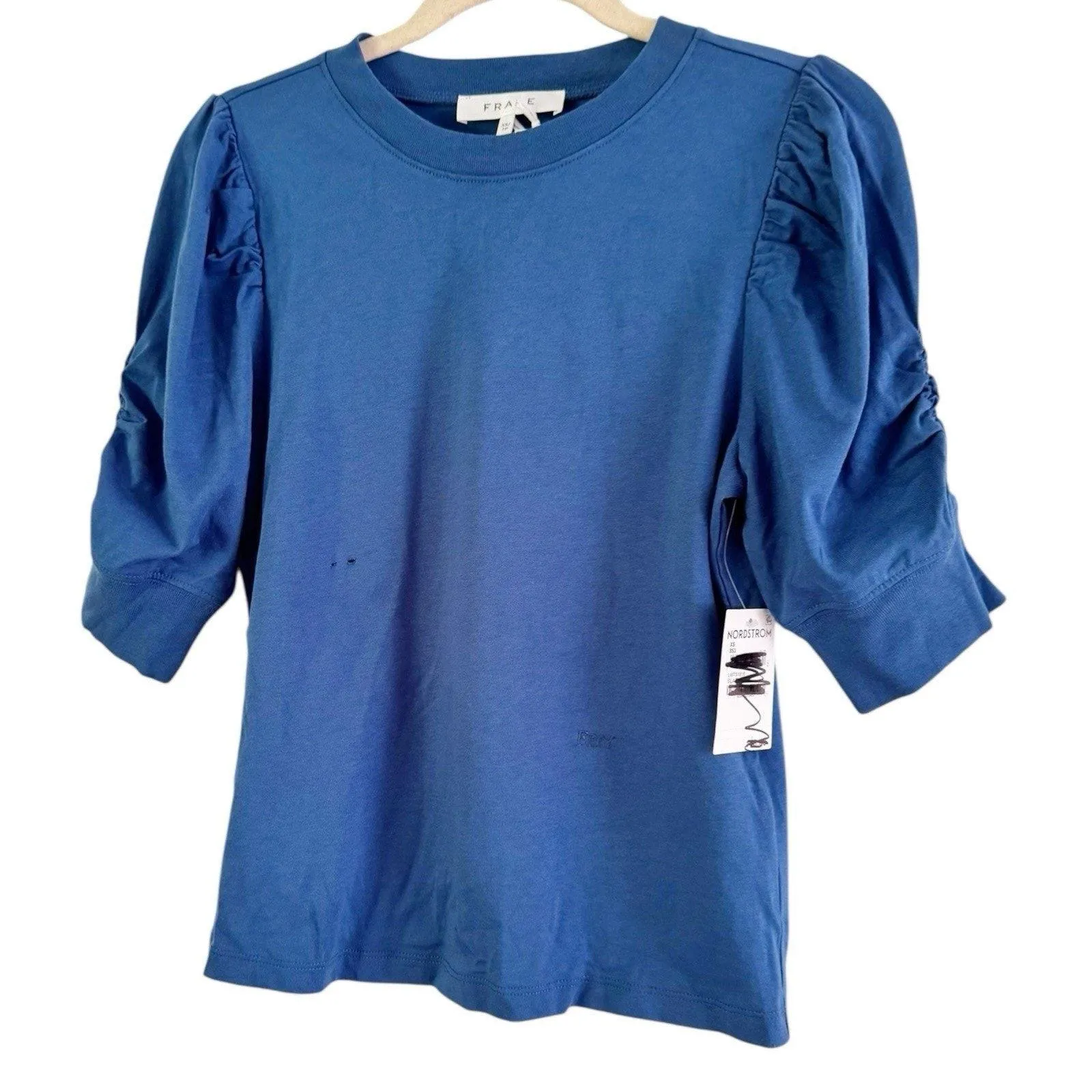 NWD Frame Frankie Ruched Puff Sleeve Top. Women’s size XS. Pullover style Small off center embroid... Show more