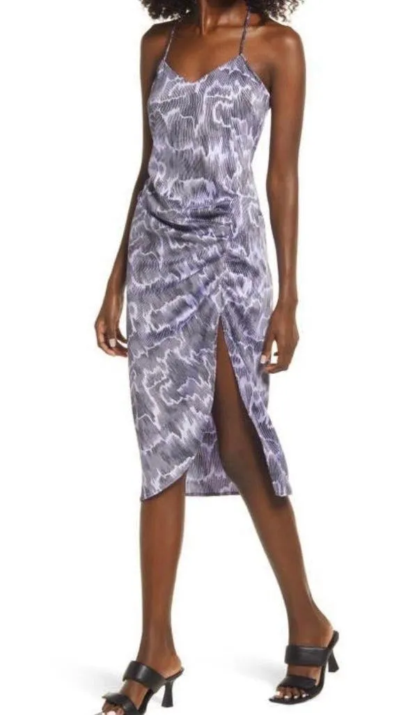 Open Edit Strappy Shirred Sleeveless Midi Dress. Date night is calling with this satiny sleeveless midi styled with slinky crossback straps, shapely ruching, and a sultry stem-showing slit. Sleeveless. Adjustable straps criss cross on the back. V-neck. Ruched detail and slit at the side of the front. Midi length. Back zip closure. Partially lined at the front of the bodice. The rest of the dress is unlined. Satin fabric. Material: 100% polyester. Brand: Open Edit Style: ED455032MI Color: Purple Animal Camouflage Size: S small Retail Price: $69 Condition: Pre-owned. See pictures for small stains on and right below the straps on the back. There's also a stain on the facing inside the chest, but this one is not visible on the outside. No other issues. Approximate measurements laying flat: Pit to pit 16.5" Waist 14" Length 43" (longest point and straight hem on back) Length 27" (shortest point on front at slit) Styles: Midis, Satin Dresses, Silky, Prints, Abstract Patterns, Cool Print Pre-owned. See pictures for small stains on and right below the straps on the back. There's also a stain on the facing inside the chest, but this one is not visible on the outside. No other issues.