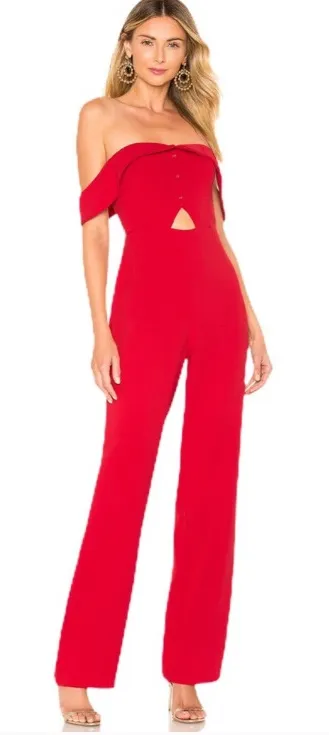 Red hot! Perfect for a night out, date, wedding, party. Previously sold at revolve. Description taken from revolve: Self: 95% poly 5% elastaneLining: 97% poly 3% elastane. Hand wash cold. Mid-weight crepe fabric. Boned bodice with front button detail. Foldover neckline and front keyhole. Exposed back zipper closure. Body measures approx 22" in lengthSleeve measures approx 3" in length19" at the knee and 19" at the leg opening The perfect Christmas party jumpsuit