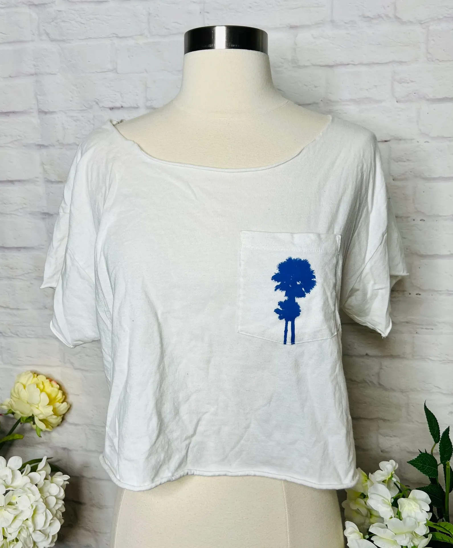 Item: Semi Cropped Tee Brand: Free People Movement Size: XS Colour: White, Blue, Black Features: Semi Cropped, Drop Shoulders, Pocket On The Front, Graphic Design On The Front And Back, Relaxed Raw Edge Look Material: 100% Cotton Condition: Good Preloved Condition With Only Minor Signs Of Wear. No Holes, Stains Or Tears Measurements: Length: 17.5” Bust: 42” Waist: 42” Shoulder: 21” Sleeve: 4”
