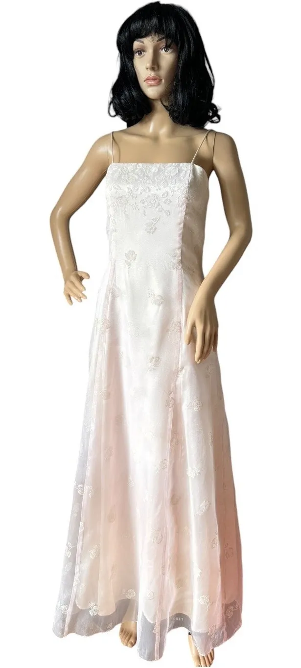 Elegant Jessica McClintock for Gunne Sax “Millennium 2000” formal gown made in the USA. This long white dress features a fitted bodice with delicate spaghetti straps and a sheer overlay adorned with velvet-flocked rose floral patterns. The gown has four layers, including a soft tulle underskirt that adds volume and graceful movement. A romantic and timeless style ideal for prom, bridal, or evening wear. Size 5. Rare collectible marking the final Gunne Sax line transition into the 2000s. Beautiful Jessica Mcclintock very pale pink dress. . There are four layers to this dress. one including a tool underneath. Sheer top layer with floral print that feels like velvet. Back Zipper closing with eye hook. Measurements are approximate •Length 57" •Waist 14" across •Armpit to armpit 15" In good preowned vintage condition. Any questions please ask. •Same day shipping or next •Bundle discount available •Five-star seller 7