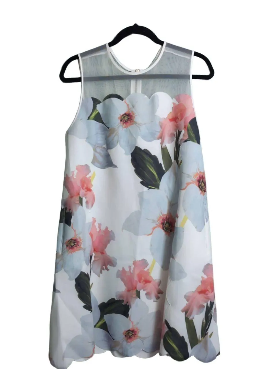 This elegant Ted Baker dress features a vibrant floral print and distinctive scalloped details, perfect for a chic look. Its comfortable A-line silhouette makes it ideal for various occasions, blending sophistication with playful charm.