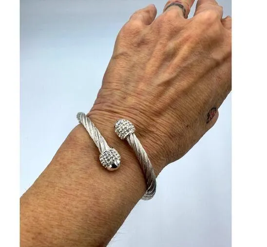 Silver Tone Rope Cuff Bracelet Embossed Crystal Rhinestone Encrusted Ends - 9" - $15 - From Sassy