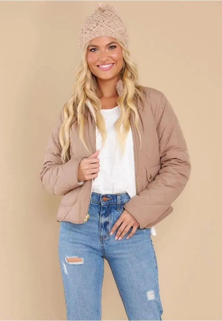 Stay cozy and stylish with this tan quilted jacket. Perfect for layering in cooler weather. Purchase... Show more