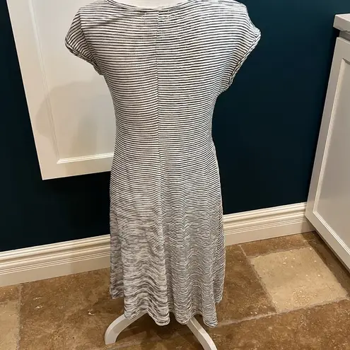 Max Studio soft knit black and white striped dress. Scoop neck, cap sleeves, faux twist tie in fron... Show more