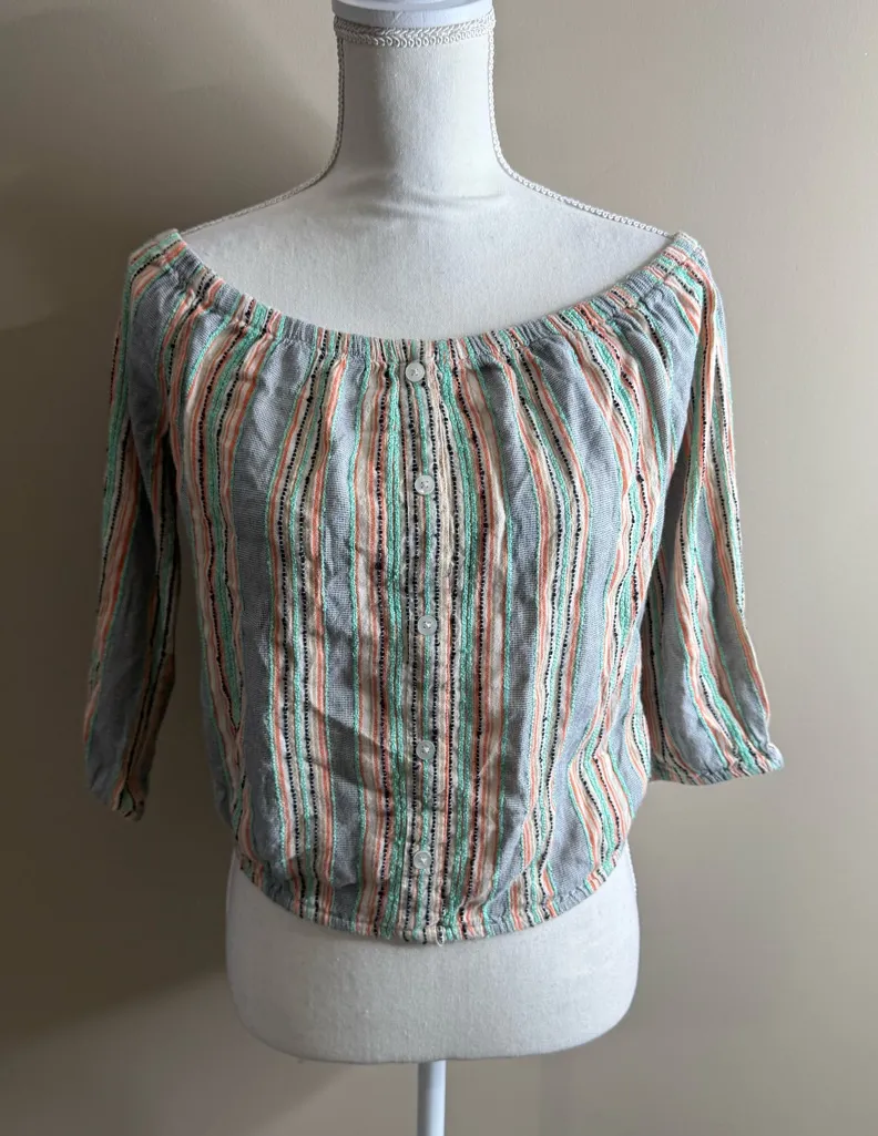Chic and stylish off-shoulder top with a striped pattern. Perfect for casual outings. Charlotte Rus... Show more