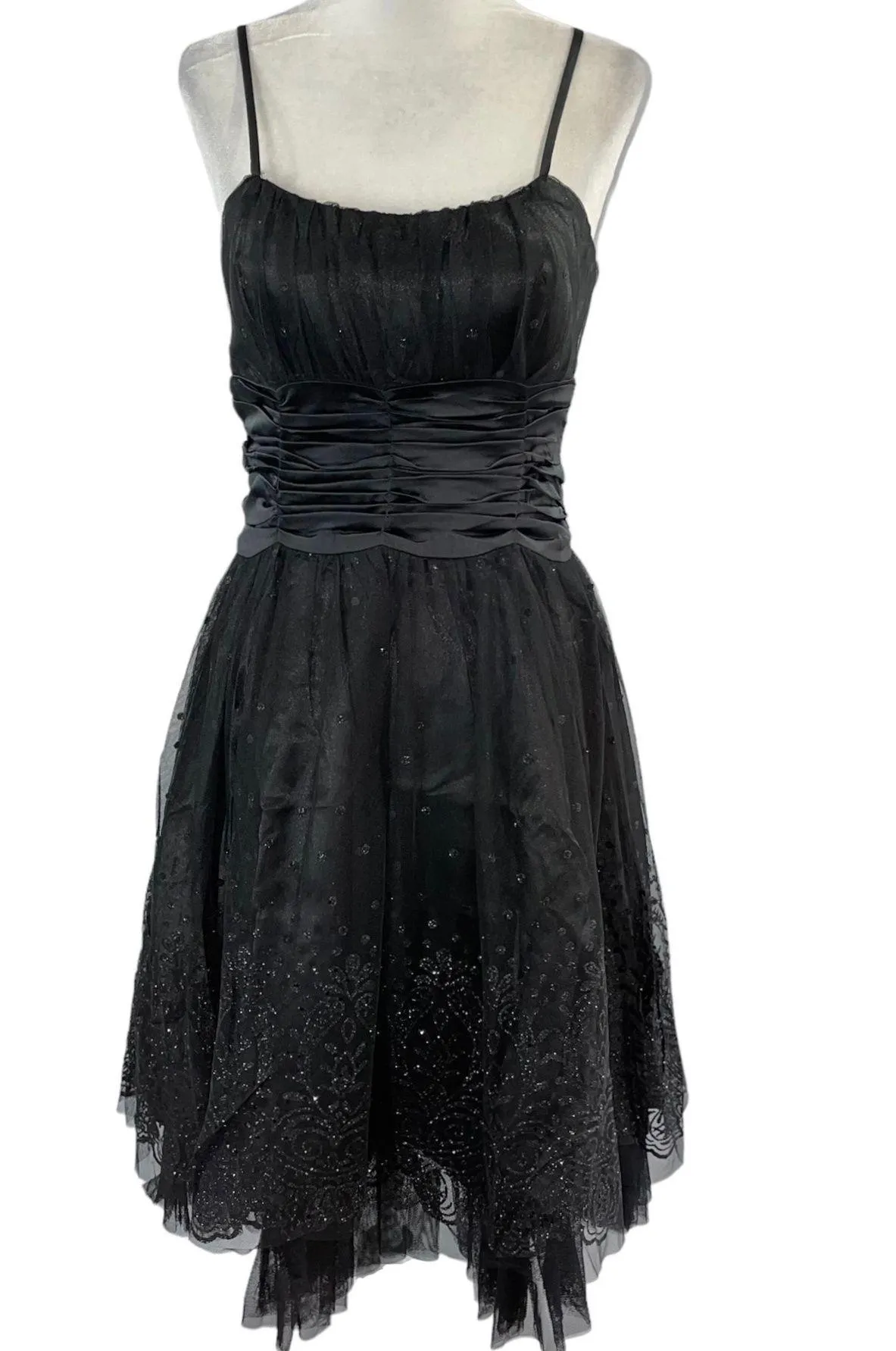 Lucy Paris glitter embellished mesh ruched satin waist cocktail dress. Sleeveless. Adjustable spaghetti straps. Molded cups. Mesh with glitter dot pattern all over and intricate pattern border at the hem. Solid satin gathered around the waist. Zipper closure on the back. Lined. Additional tulle under the satin lining adds volume to the skirt. Material: 100% polyester. Brand: Lucy Paris Style: R69595 Color: Black Size: S small Retail Price: $98 Condition: NWT new with tags Approximate measurements laying flat: Pit to pit 15” Waist 13” Length 37” Style: Evening, Eveningwear, Black Tie, Special Occasion, Event, Party, Wedding, Wedding Guest, Holidays, Holiday Party, Christmas, New Years, Beautiful, Pretty, Luxe, Glam, Glamorous, Glittery, Sparkle, Sparkly, Shimmer, Shiny, Shine, LBD, Little Black Dress, Sheer