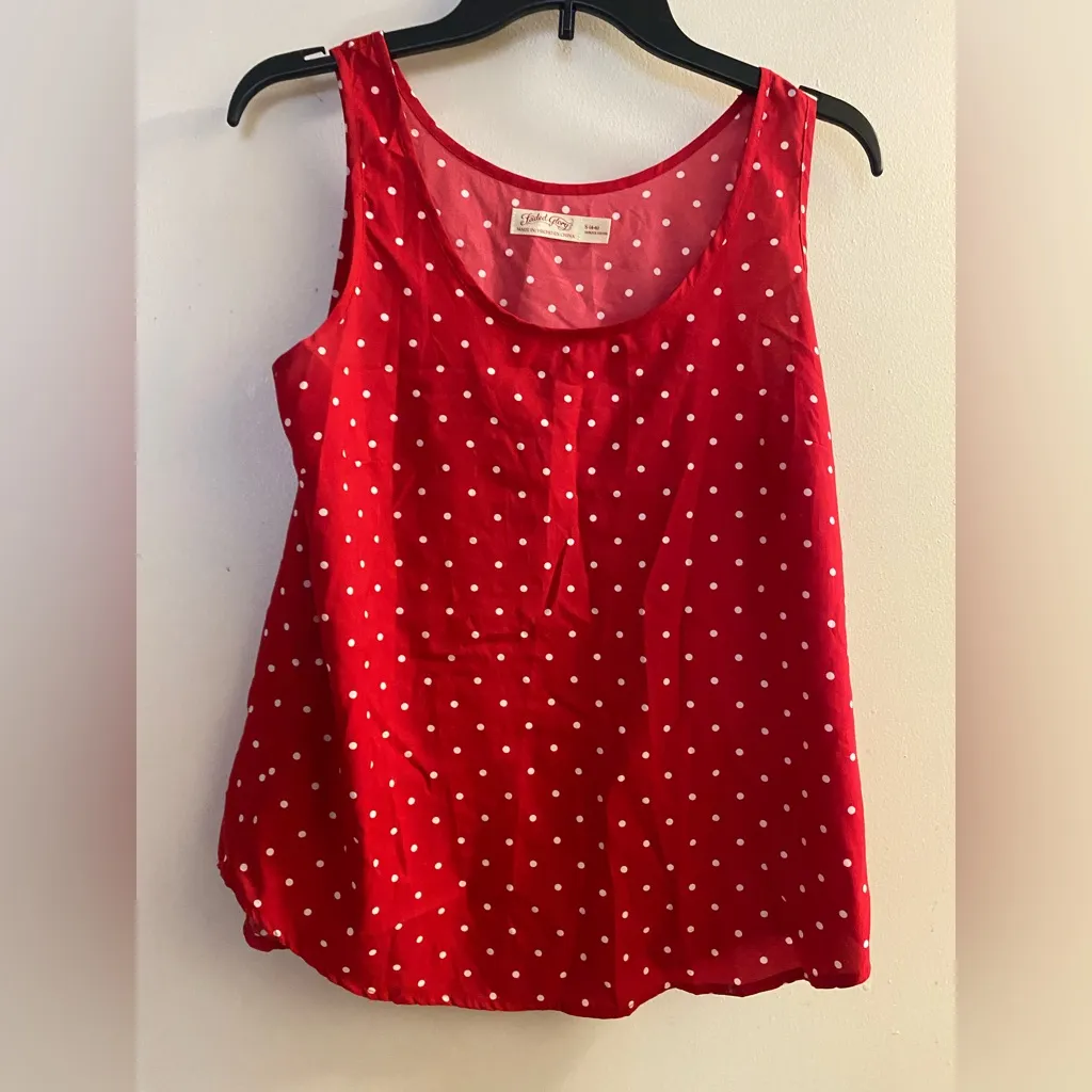 Vibrant red tank with white polka dots. Sleeveless and breezy. Ideal for casual wear. Length 26” Po... Show more