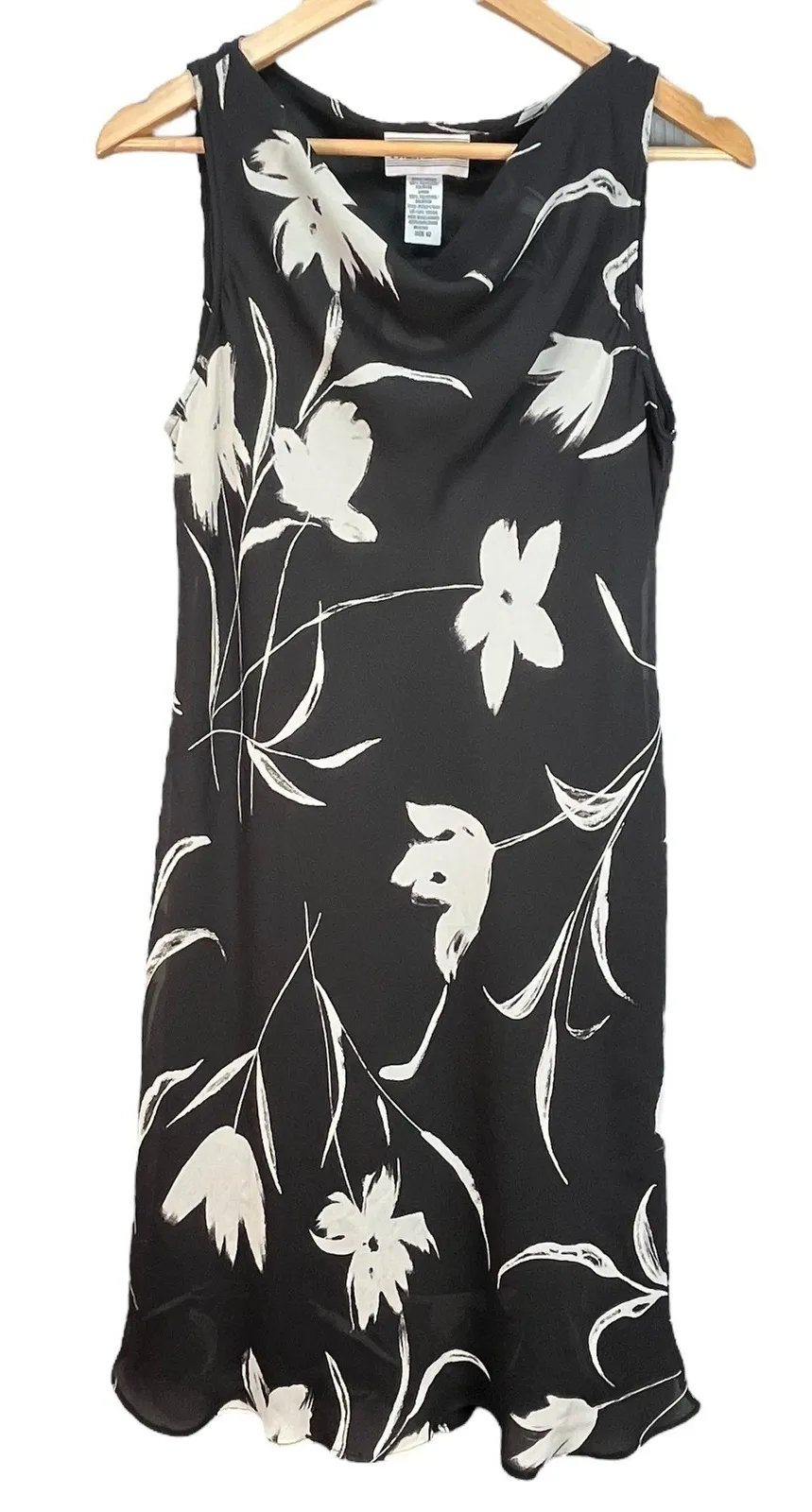 Elegant and timeless sleeveless dress by SL Fashions. Features a cowl neckline, black base with ivory floral print, and a fully lined design for a smooth fit. The lightweight polyester fabric drapes beautifully, perfect for cocktail parties, weddings, or special occasions. • Brand: SL Fashions • Size: 12 • Material: 100% Polyester (lining: 100% Polyester) • Made in: Philippines • Condition: Pre-owned, excellent (no noted flaws) • Measurements: • Chest: 18" • Length: 37" Ships within 1-2 business days.