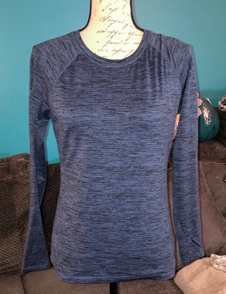 S911: ClimateRight by CuddlDuds Stretch Fleece Long Sleeve Crew Neck Top Size Small Royal Blue and Black Pullover style Crewneck Long Sleeve thumbholes high-low hem Stretch Fleece brushed on inside for thermal protection Pit to pit approximately 18” Length approximately 25”