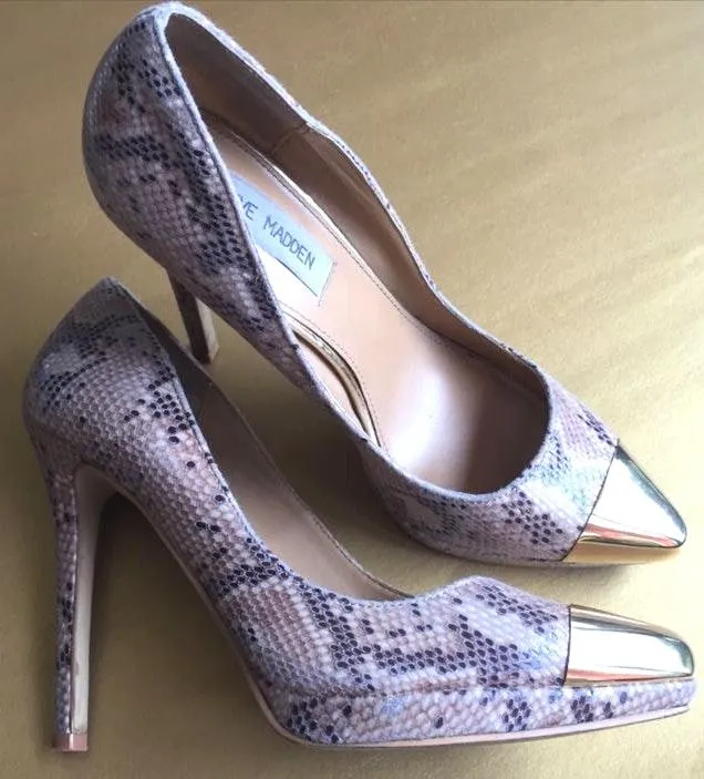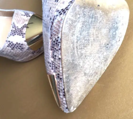 Beautiful snakeskin Heels with gold accents Heel is 4 3/4 high In excellent used condition Will shi... Show more