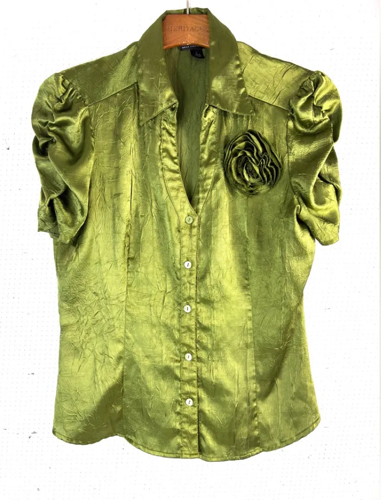 Excellent pre-owned condition Elegant green satin blouse with a floral accent. Features puffed sle... Show more