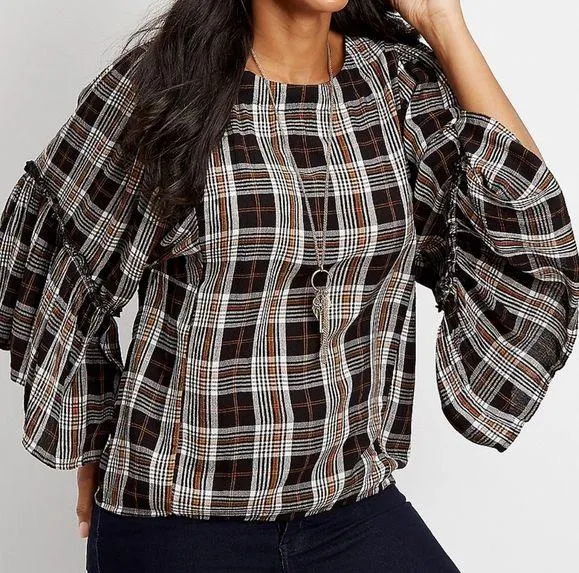 Maurices Plaid bell sleeve top lightweight and comfortable fabric plaid print scoop neck with v-bac... Show more