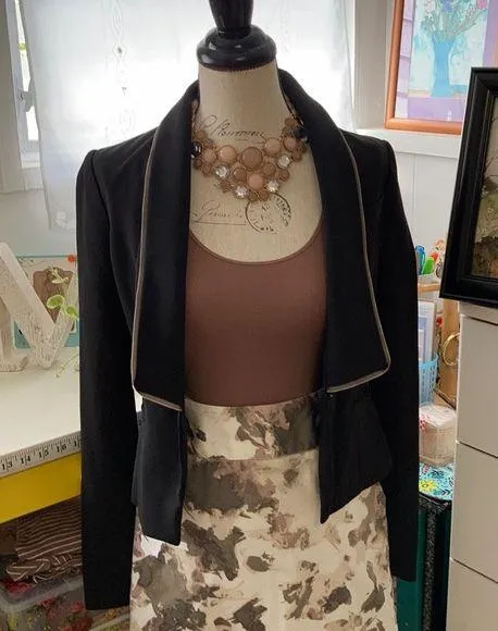 BCBG Maxazria black one button suit blazer/jacket. Collar accent is mesh over a nude strip. Elegant.