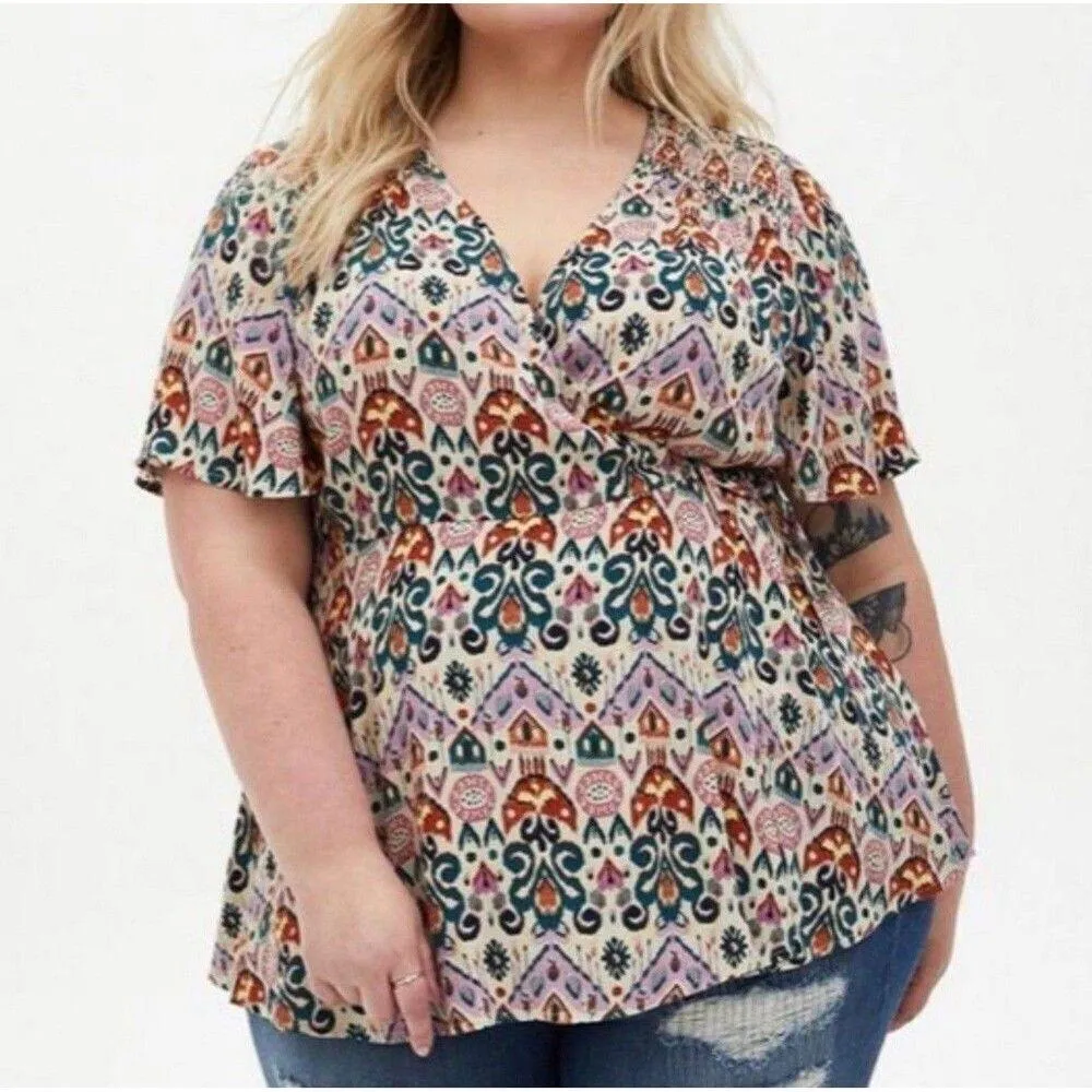 The Torrid Crepe Smocked Wrap Tie Front Multi Tribal Boho Print Top in size 3X features a beautiful... Show more