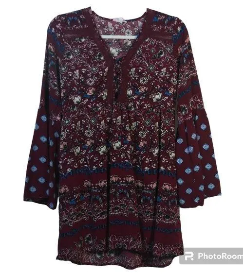 Socialite Burgundy Bell Sleeve Boho Dress Size M Lace tie up front Long sleeve Bell sleeve cuff... Show more