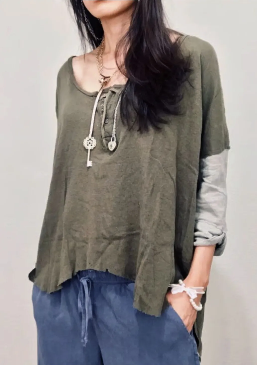 Free People, Henley, green, retro trendy star henley, distressed, star, grunge, oversized, retro, women XS, boho, vintage style, rib knit, 90s, rock, relaxed, lounge, streetwear, linen, cotton, scoop neck, color blocked, beach, biker
