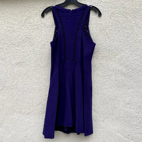 Purple embellished circle flare dress by Rebecca Taylor, size 6. Sleeveless, notch neckline, crochet trim cutouts front & back, fully lined, back zip closure, rayon/viscose blend. Very good condition with light wear and no stains or flaws. Laying flat measures about 17.5" pit to pit, 16.5" across narrowest part of waist, 36.5" shoulder to hem. I always pack carefully and ship out by next business day!