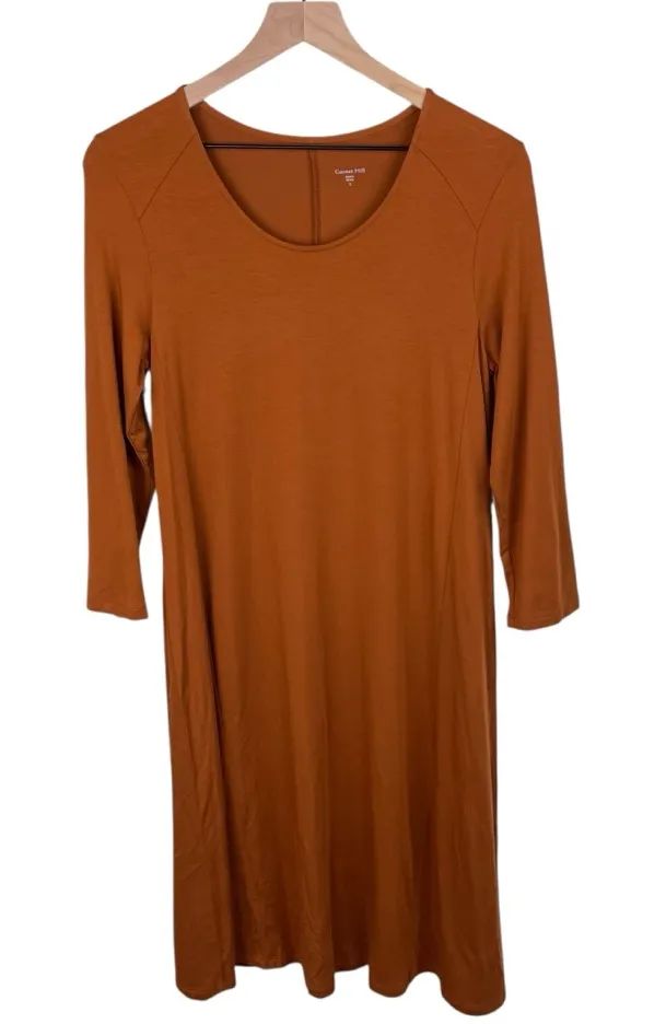 Garnet Hill Seamed Knit Trapeze Dress Style 48312 Enjoy your day with the greatest of ease in our trapeze dress. This easy silhouette has a classic fit through the chest and shoulders and flows beautifully from the waist in soft TENCEL Lyocell. Make it your four-season favorite with sandals or boots. Solid burnt orange, pumpkin orange color. Perfect for fall! Scoop neckline 3/4 sleeves Forward-rolling shoulder and side seams TENCEL Lyocell/elastane Machine wash size + fit Classic fit through the chest – follows your shape without being snug Above-knee length Excellent pre-owned condition Approximate measurements: Pit to pit: 19” Length from shoulder: 41”