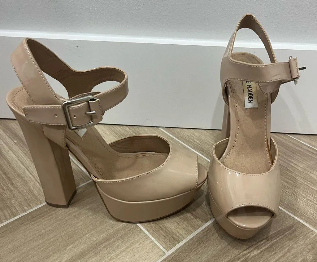 Adorable Steve Madden nude (fawn) patent leather heels great for any special occasion.