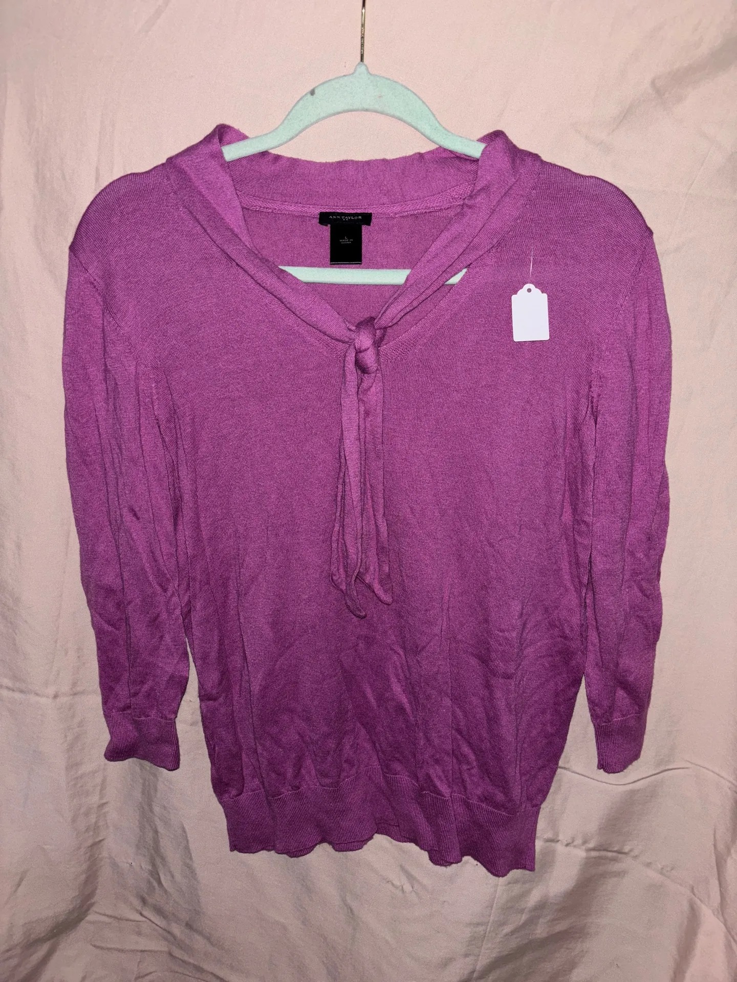 Ann Taylor Sweater Tie Collar 3/4 Sleeve Gathered Hem Cotton Blend Purple Size L - $15 - From Alyssa