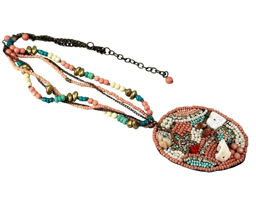 . Unbranded. Multi-Strand. Lots of Color Shades. Beach, Boho, Gypsy, Hippy. • Multi-strand chain with beaded details • Vibrant mix of coral, turquoise, and gold hues • Shell accents with rhinestone embellishments on Pendant • Adjustable with extender chain. lobster claw clasp closure Previously worn condition. May have scratches or scuffs from previous wear and age. Please see photo's for measurements You may see reflections of the light setup in photos. Condition: Pre-Owned Good good previously worn condition