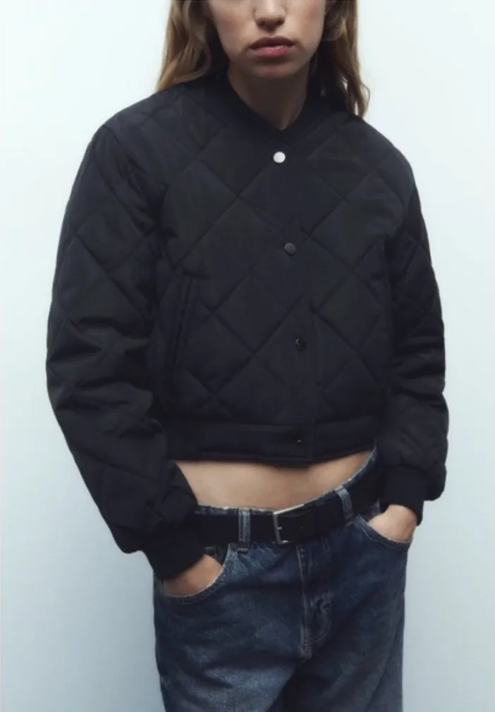 Zara quilted cropped bomber jacket round collar jacket with cuffed long sleeves. Front double welt p... Show more