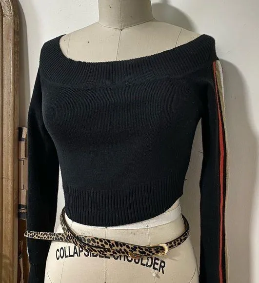 Off the shoulder Thick cropped sweater Black, white and rust orange stripes down the sleeves In ne... Show more