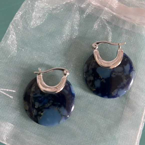 Excellent preloved condition - Sodalite Gemstone Crescent Disc Drop Earrings A beautifully stylish interpretation on the classic hoop earring design, these stunning earrings features a crescent shaped piece of polished sodalite stone set on a base of silver. These huggie earrings fit along the contours of your earlobe and are finished off with a secure v-lock closure. Simple, yet elegant at the same time, these versatile earrings will look great with just about anything. Due to lighting item’s color may vary slightly from pictures. Thanks for checking out my listing.