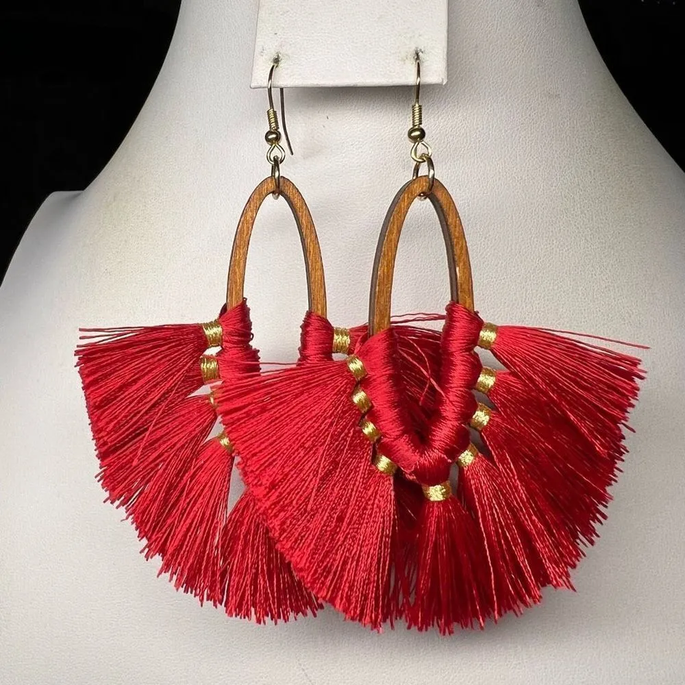 Boho‎ Ethnic Fringe and Wood Chandelier Earrings Red - $15 - From A Little