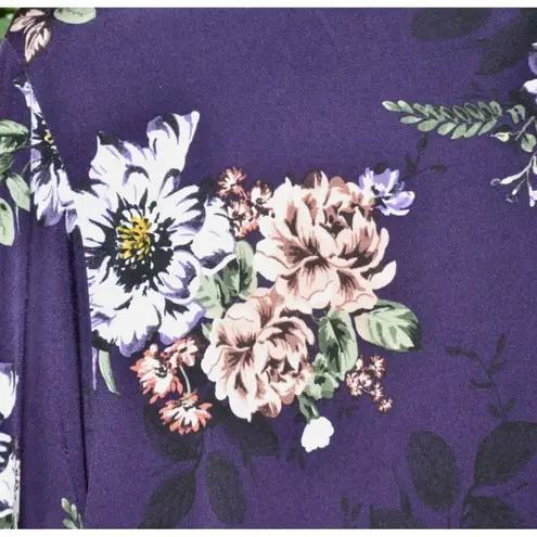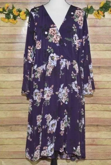 Elegant purple floral dress with a V-neck wrap look. Features long bell sleeves and sheer stretch fa... Show more
