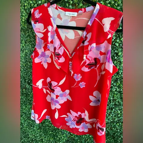 Calvin Klein, beautiful bright red with floral pattern. It has sheer, flutter sleeves and three butt... Show more