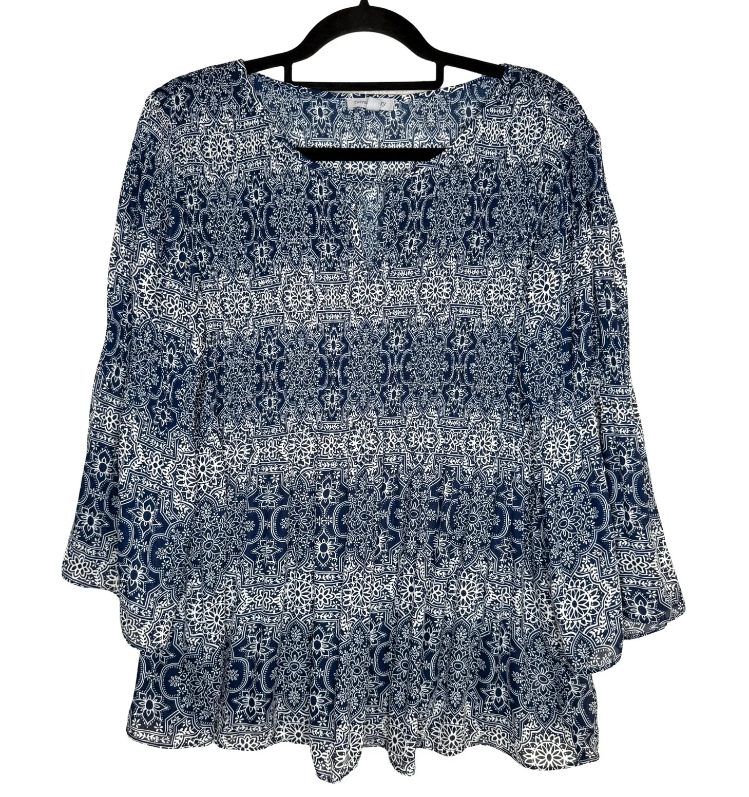 Floral & Ivy Boho Paisley Long Sleeve Peplum Top. Excellent preowned condition. This lightweight blouse features a stunning blue and white boho paisley print, flowy bell sleeves, and a flattering peplum hem. Perfect for casual days, workwear, or a relaxed weekend look! DETAILS: • Size: Medium • Color: Blue & White • Material: 100% Polyester • Features: Long sleeves, boho paisley print, peplum hem, notch neckline, lightweight woven fabric, pullover MEASUREMENTS (approximate, laying flat): • 18" bust • 28" length KEYWORDS: boho, paisley, peplum, flowy, feminine, casual, women's, blouse, top, everyday, chic, spring, fall, winter, cottagecore, coastal, minimal, workwear, office, career Please note that product color may slightly vary due to lighting or monitor settings. Always open to offers & happy to answer any questions you have! (574)