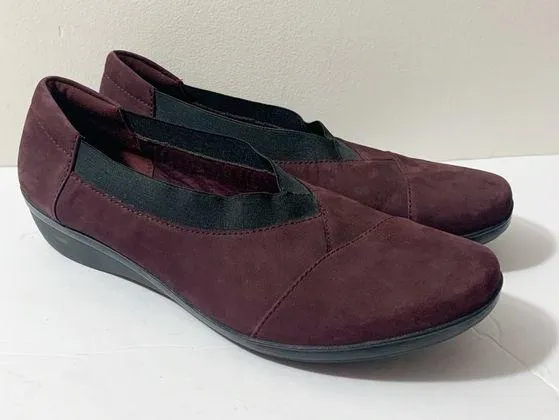 EUC Clarks Collection Everlay Eve Aubergine Suede Slip On Wedge Loafer Size 10M Aubergine color sue... Show more