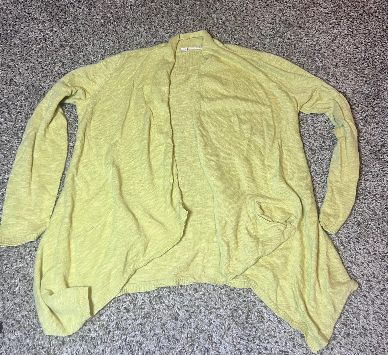 Keywords: Eileen Fisher, cardigan, sweater, linen blend, cotton, open front, yellow, lightweight, casual, boho, bohemian, drape front, size M, womens cardigan, spring cardigan
