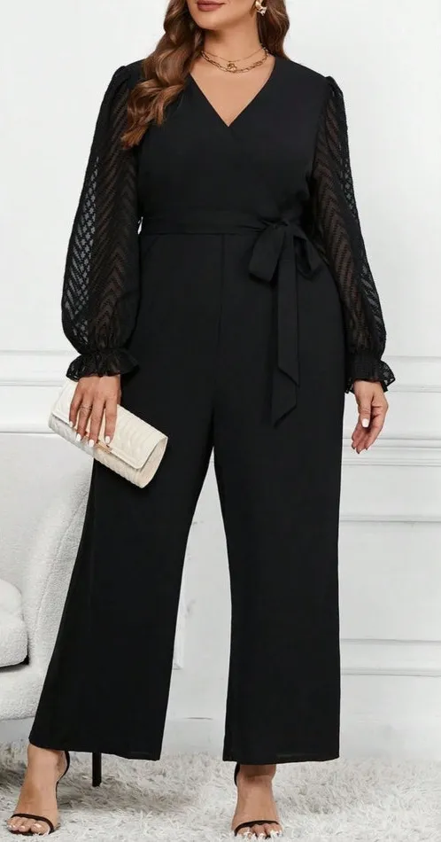 NWOT SHEIN Curve Clasi Plus Contrast Mesh Belted Jumpsuit Size: 2XL Pantsuit Belted waist Cross fron... Show more