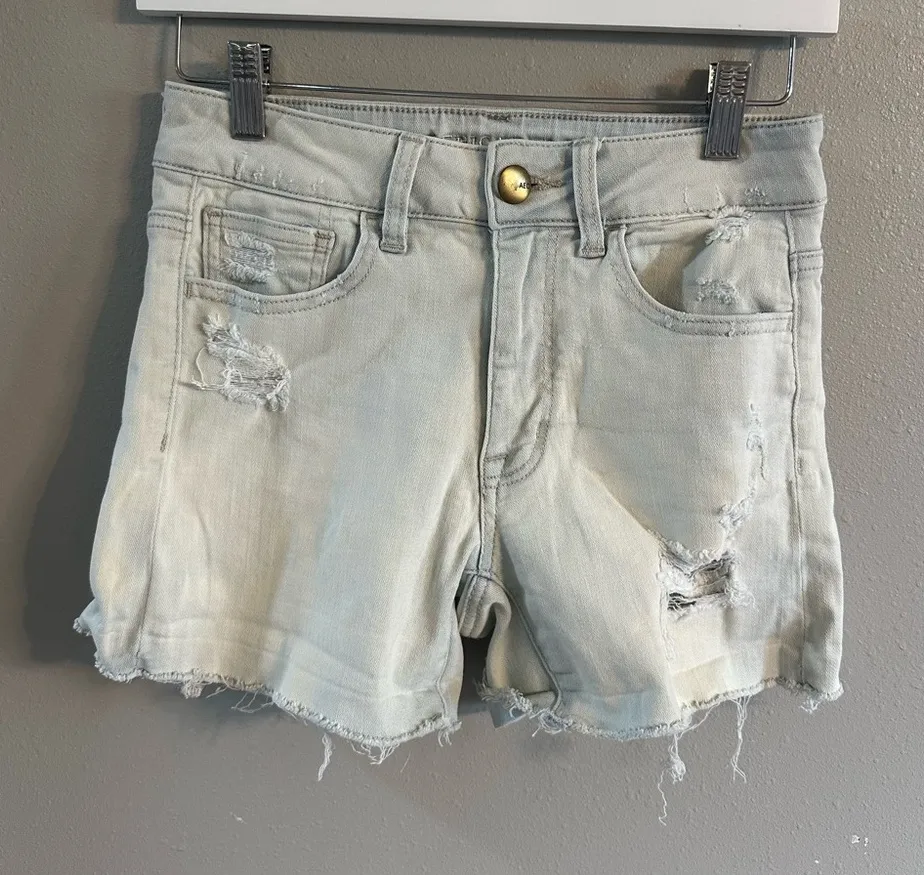 Trendy faded denim shorts. Distressed back pockets. Ideal for everyday style.