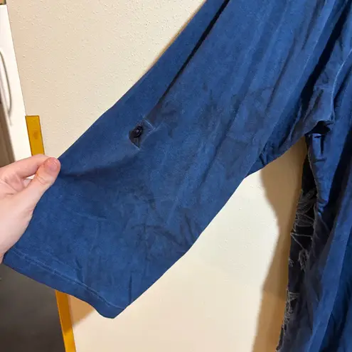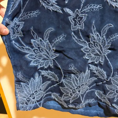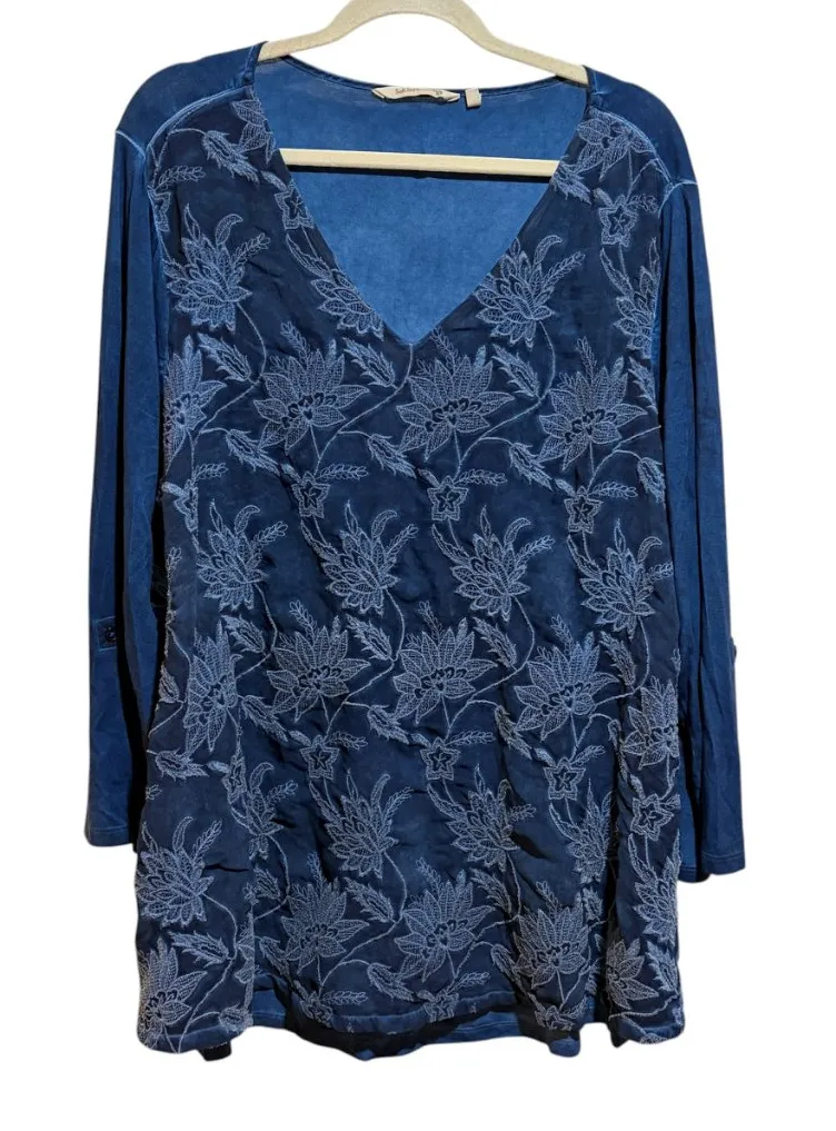 Soft Surroundings Blue Lace Front Top. V neck. Button tab roll sleeves. Dark blue. Front panel is sheer embroidered layer over jersey lining. Irregular natural dye varied tie dye look. There are a few particularly dark spots in back near bottom. Size 3X. Some crinkling around lace.