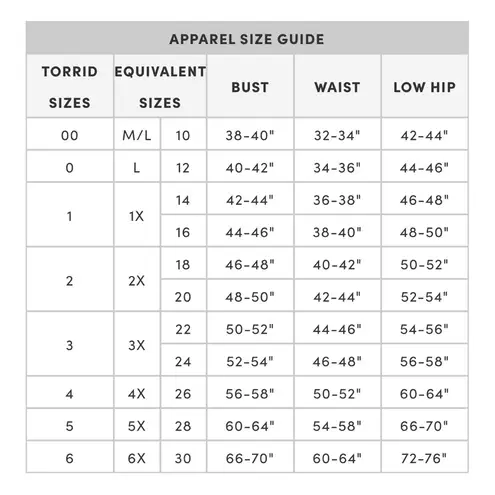 size 0 which is a size L/12 according to Torrid’s size chart. I’m a size 14/16 and this fits me perf... Show more
