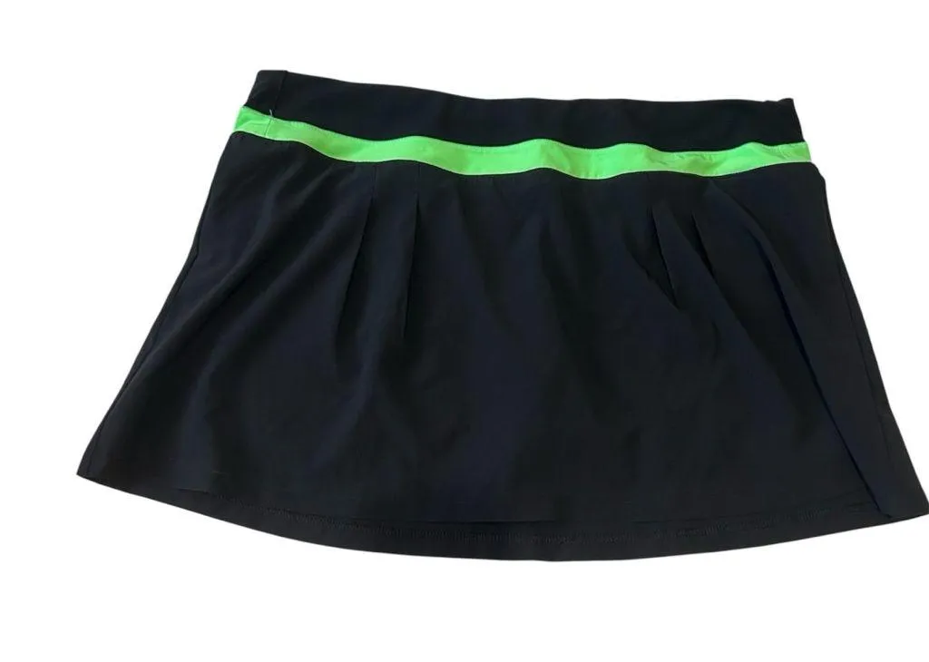 Black athletic tennis skort with lime green detailing. Built in shorts have a pocket on leg. Climali... Show more