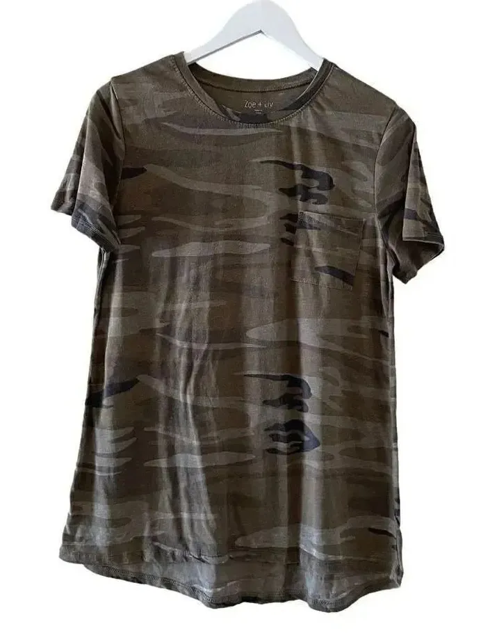 Zoe & Liv Camo Gray Cotton Blend Soft Women’s Short Sleeve T-Shirt SZ XL #1073 Excellent preowned condition with no flaws. Measurements may be found in photos. Ship Same/ Next Day. Professional Seller. Offers Welcome. Bundle and Save! Smoke free and pet free home.