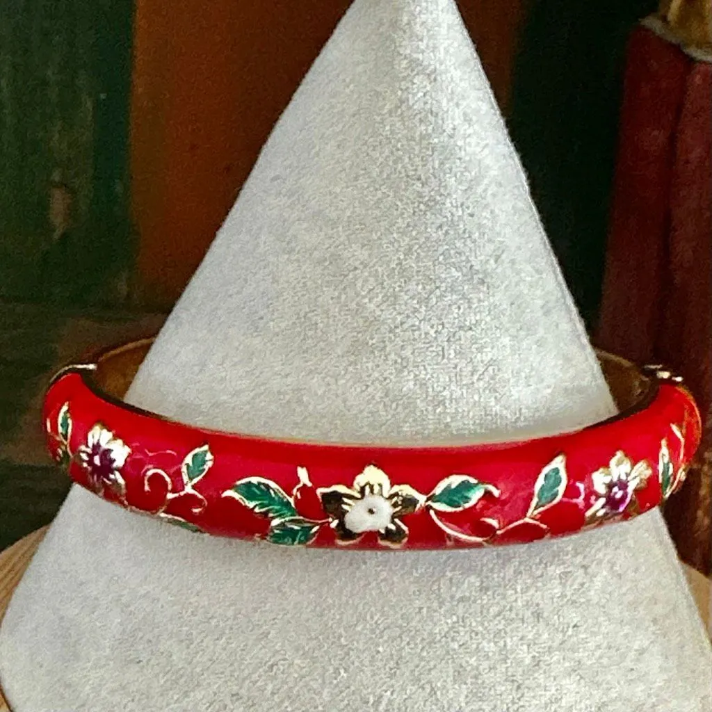 🌸 Beautiful and vibrant red enamel bangle featuring hand-painted floral cloisonné detailing with g... Show more