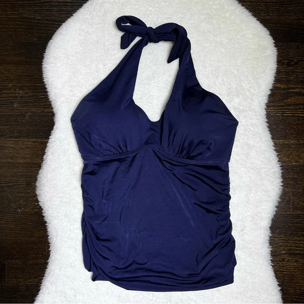 Preowned / used Tankini swim top from Athleta. Navy blue. Molded cup. UPF 50+. Tie back and band wit... Show more