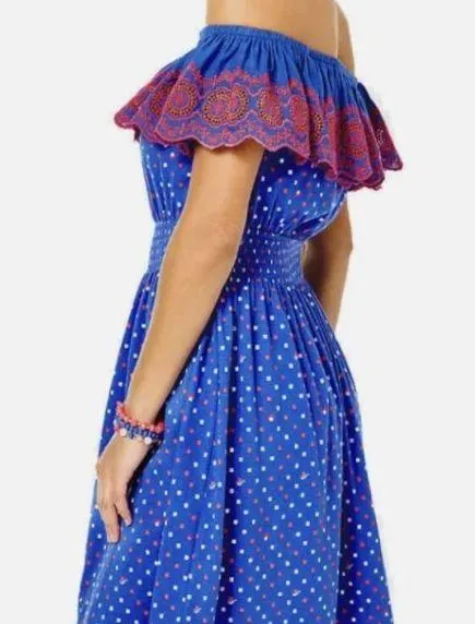 Lilly Pulitzer dress Kalama Of Shoulder Dress size XS Blue with square dots. Fit N Flare... smocked... Show more