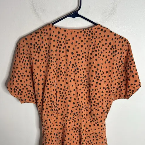 Marine Layer Camila Mini Dress in Abstract Cheetah Print Great used condition, size M Color Rust Orange/Black Pockets on the side Flutter-sleeves A-line design Buttons up the front Hidden hook for modesty V Neckline Unlined Imitation belt at waistline with sewn-in ties for bow at back and tucks 100% Tencel Measured flat: Pit to pit 20" Approx. from the Back Length 34.5" 10.8